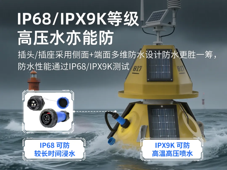 海洋環(huán)境監(jiān)測設(shè)備部署周期長達(dá)數(shù)月甚至數(shù)年,無論是潮濕度極高的環(huán)境水分,還是惡劣天氣裹挾著的水浪沖擊,都要求設(shè)備所用連接器具備高規(guī)格的防水性能。