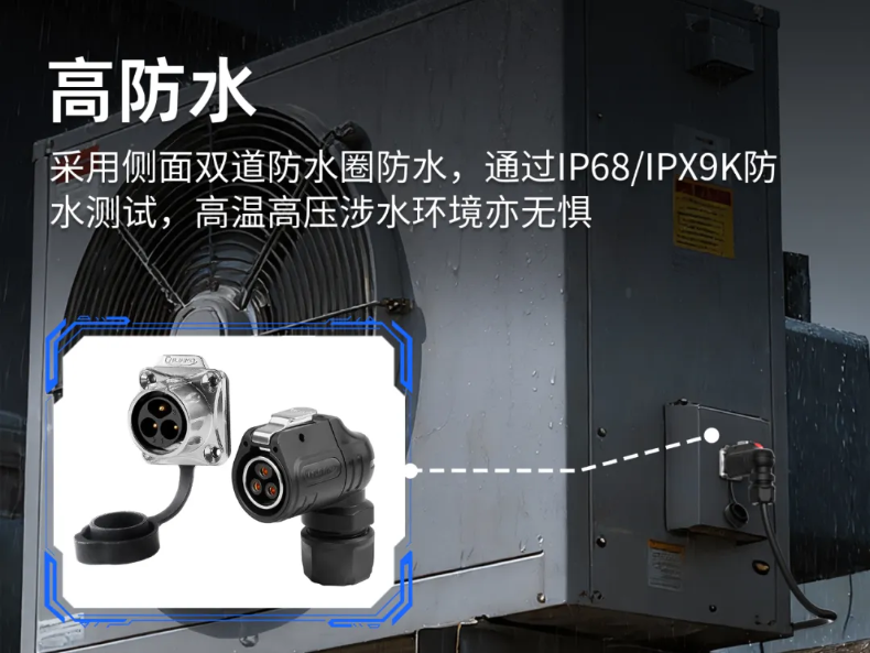 風扇散熱器用工業(yè)級防水連接器要求具備優(yōu)異環(huán)境性能:1、能耐受高溫,才能保障散熱器穩(wěn)定運行;2、要能耐受冷卻液、切削液等腐蝕環(huán)境;3、最重要的是要具備IP65以上防護等級,以抵御車間可能存在的水液與粉塵侵襲。