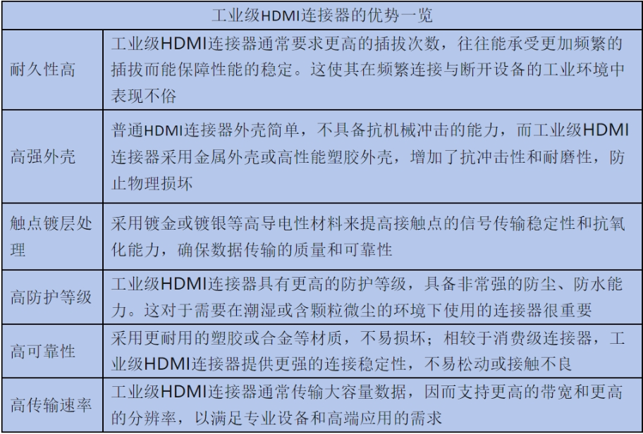 HDMI連接器是一種實(shí)現(xiàn)圖文、視頻等高速傳輸?shù)母咔鍞?shù)據(jù)連接器,其應(yīng)用非常廣泛,是非常主流和成熟的數(shù)據(jù)傳輸接口方式。對(duì)于日常布線,普通的HDMI連接器足矣,但對(duì)于戶外、醫(yī)療、工業(yè)等復(fù)雜且嚴(yán)苛的使用場(chǎng)景,就需要采納工業(yè)級(jí)HDMI連接器,才能保障可靠、安全與穩(wěn)定的運(yùn)行。
