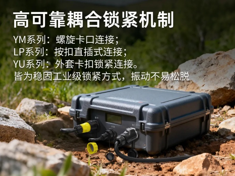 凌科YM系列工業(yè)連接器為螺旋卡口連接;LP系列工業(yè)連接器為按扣直插式連接;YU系列工業(yè)連接器為外套卡扣鎖緊連接。皆為穩(wěn)固工業(yè)級鎖緊方式,在脈沖震源勘探設(shè)備的振動應(yīng)力下不易松脫。