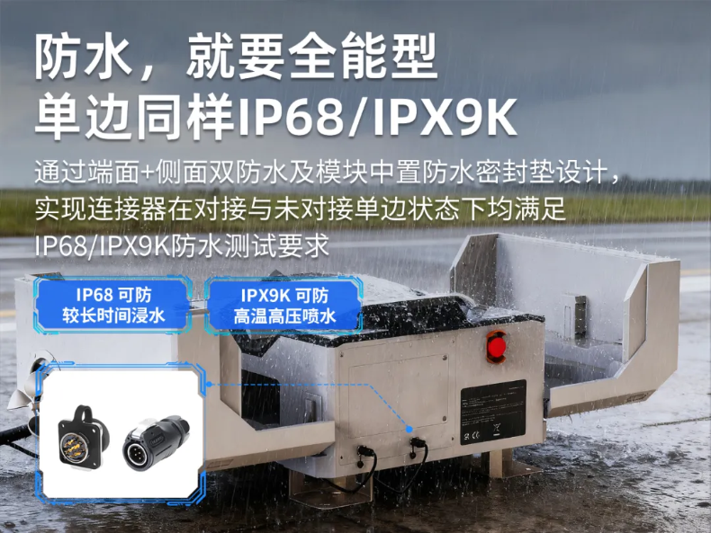 那么凌科LP20氣密性連接器滿足所需防水防塵要求嗎?何止?jié)M足?簡直是超越。它具備滿貫級防水能力,滿足IP68/IPX9K防護等級,而且更難能可貴的是單邊也是同樣配置,即便拔下連接器,也不用擔心水液侵襲,這對于智能停機坪非常重要。