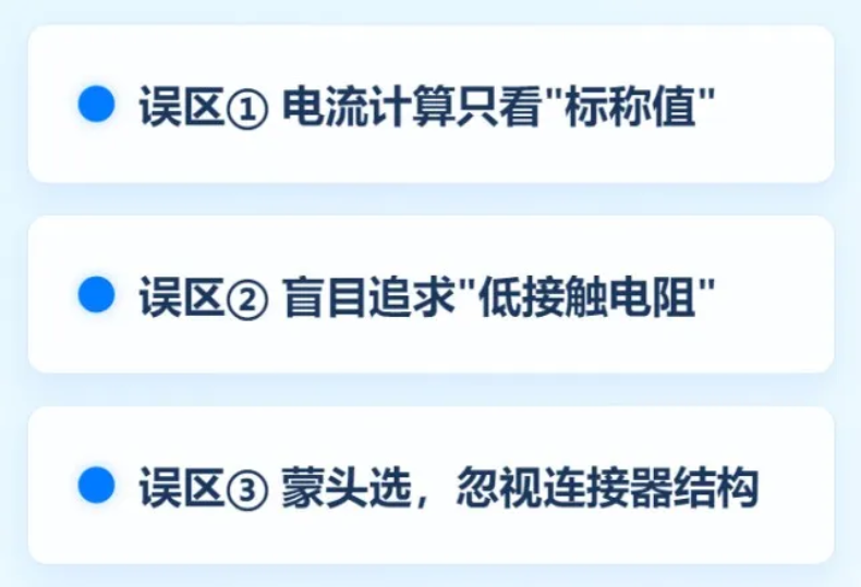 大電流連接器作為電力傳輸?shù)?ldquo;咽喉要道”,其選型直接影響設(shè)備可靠性。但許多工程師在選型時,往往過度依賴供應(yīng)商的“標(biāo)稱參數(shù)”,而忽略實(shí)際工況的復(fù)雜性。本文將從3大誤區(qū)出發(fā),深度解析,助你避開“深坑”。