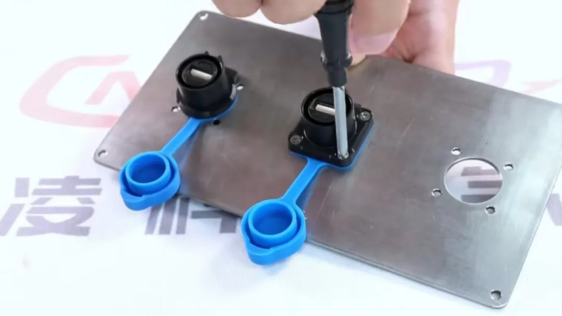 該款產(chǎn)品的插座安裝相對簡單,只需將其安裝固牢在安裝面板上即可,其中四孔插座需要用到工具螺絲刀。要注意的是安裝面板板厚最大為3.0 mm,擰緊的扭力值保持在1.5±0.1N·m。