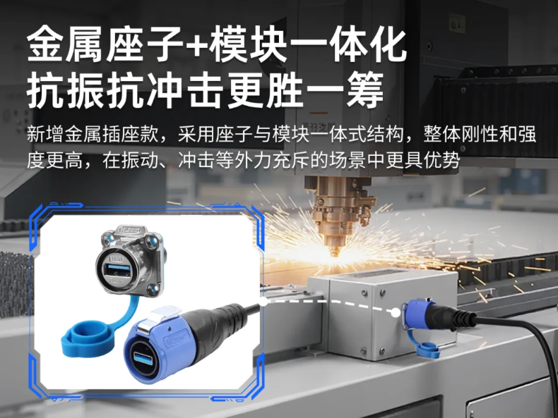 凌科LP20-USB連接器全新金屬插座,座子與模塊一體式結(jié)構(gòu),整體強(qiáng)度和剛性更強(qiáng),更適配激光切割機(jī)訴求。特點(diǎn)如下: