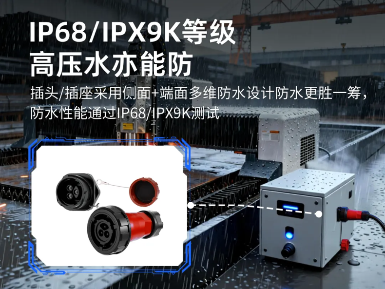 DL28系列工業(yè)級大電流連接器通過了IP68(防塵、防水浸泡)及IPX9K(防高壓高溫水射流)雙重測試。這不僅可防護濺水,更能應(yīng)對設(shè)備清潔或惡劣環(huán)境下的高壓水,從而確保連接器在激光切割機復(fù)雜工況下的長期可靠性。