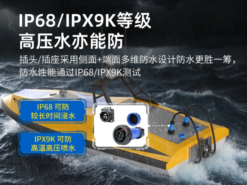 無(wú)人船一般都相當(dāng)小巧緊湊,留給連接器安裝的空間有限。如果采用體積龐大的IEC60309插頭之類,勢(shì)必會(huì)占用過(guò)多空間,增加重量,不利于系統(tǒng)集成和輕量化設(shè)計(jì)。
