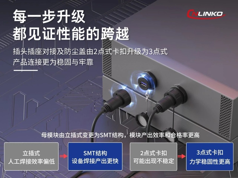 作為YU系列的2.0版,其在結(jié)構(gòu)與工藝上作了較大的升級(jí)。其一,插頭插座對(duì)接及防塵蓋由2點(diǎn)式卡扣升級(jí)為3點(diǎn)式,力學(xué)穩(wěn)固性更強(qiáng),結(jié)構(gòu)不易出現(xiàn)松動(dòng)等現(xiàn)象;其二,母模塊由立插式變更為SMT結(jié)構(gòu),設(shè)備焊接產(chǎn)出更快,產(chǎn)品的一致性更高??偠灾?,2.0版其性能實(shí)現(xiàn)了進(jìn)一步升級(jí)。