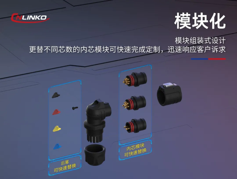 連接器后塞提供多色系選擇(如黑、藍(lán)、黃、紅等)。用戶可輕松實(shí)現(xiàn)可視化管理,芯數(shù)或類型通過(guò)顏色即可瞬間辨識(shí),徹底告別在連接器或設(shè)備上“貼便簽、做記號(hào)”的繁瑣操作。
